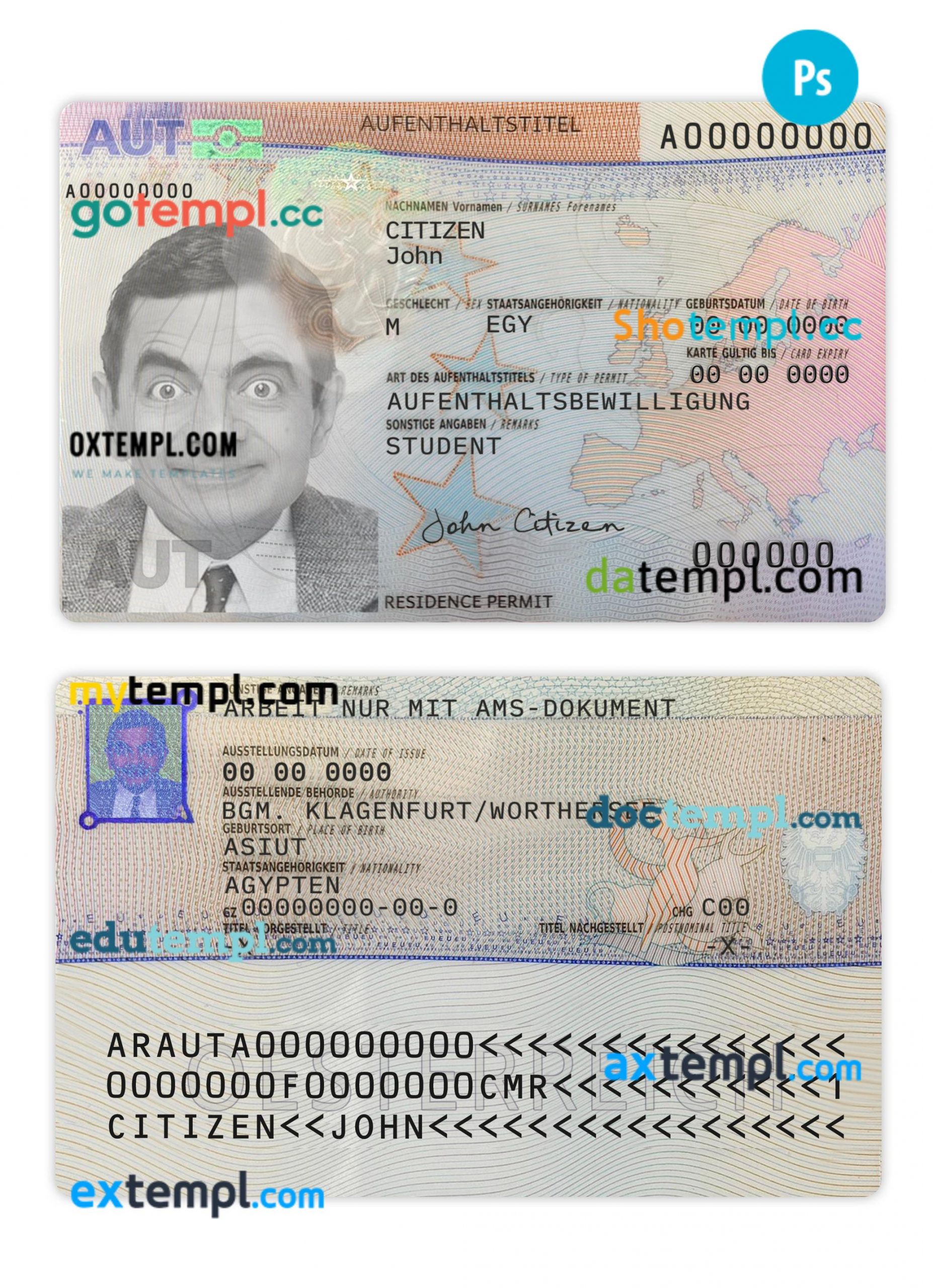 Completely editable Austrian residence permit card template in PSD format.