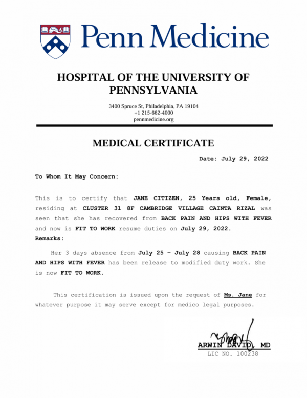 Hospital of the University of Pennsylvania medical certificate download template fully editable