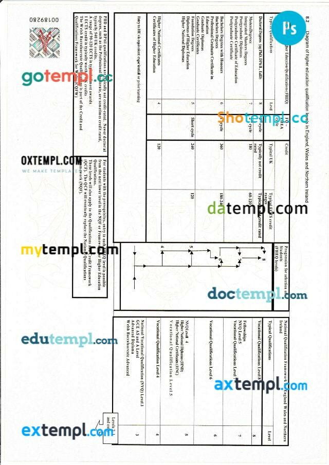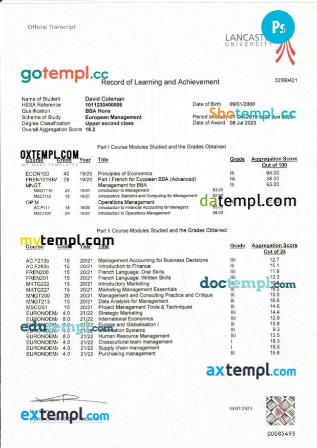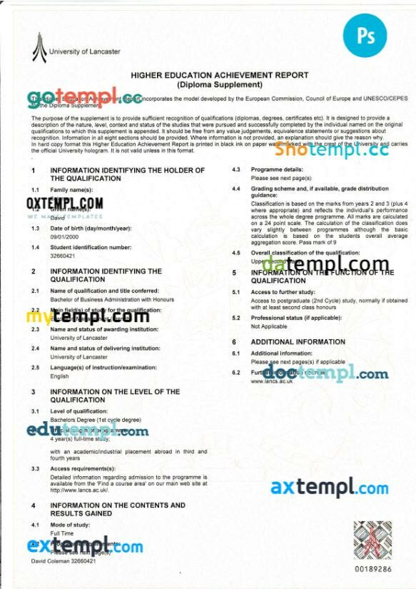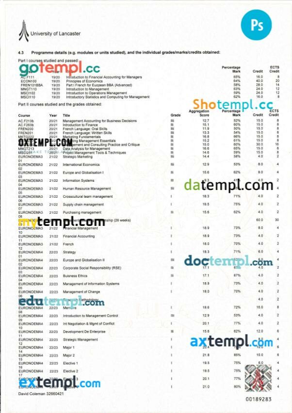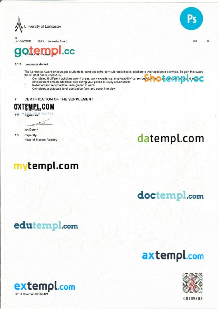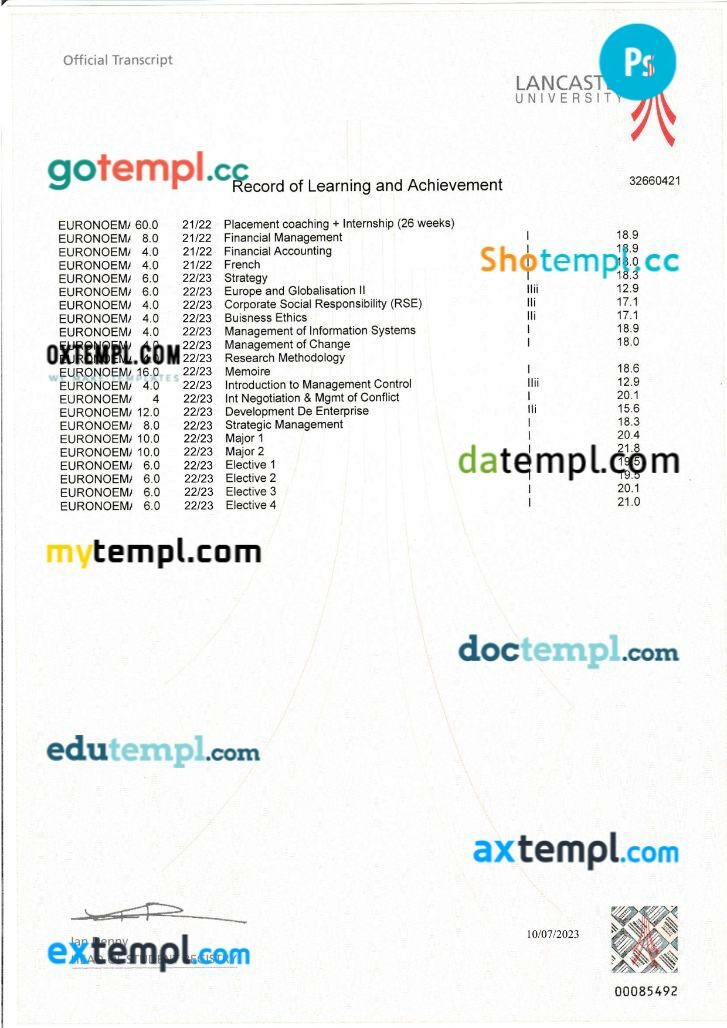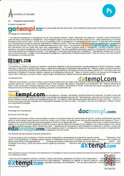 United Kingdom Lancaster university transcript in PSD format, 11 pages