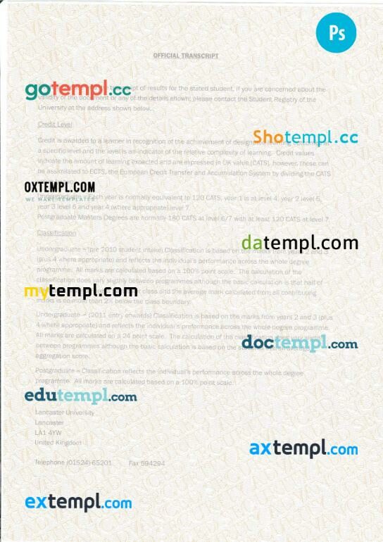 United Kingdom Lancaster university transcript in PSD format, 4 pages